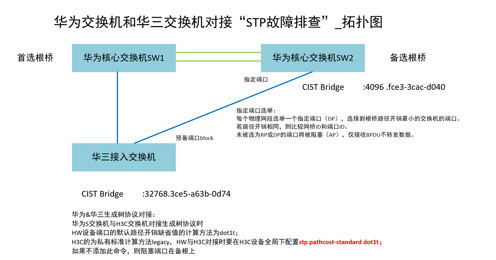 H3C的为私有标准计算方法legacy,HW与H3C对接时要在H3C设备全局下配置stp pathcost-standard dot1t;