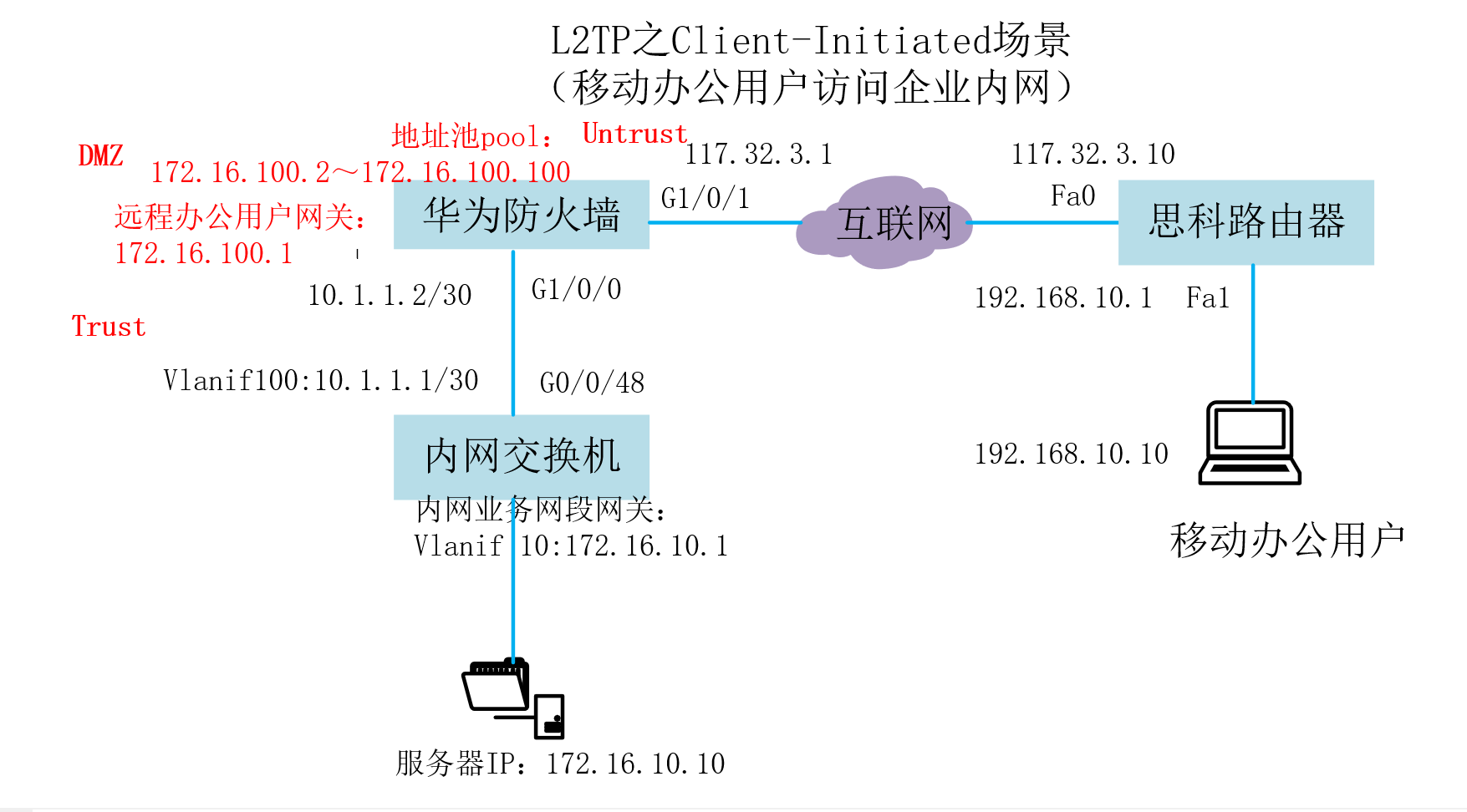 | L2TP配置 | 对端隧道名称:client用户名:user0001密码:Password123隧道验证密码:Hello123地址池pool:172.16.1.2~172.16.1.100说明:若内网服务器IP地址与地址池的IP地址不在同一网段,需要在内网服务器上配置到地址池的路由。 | |