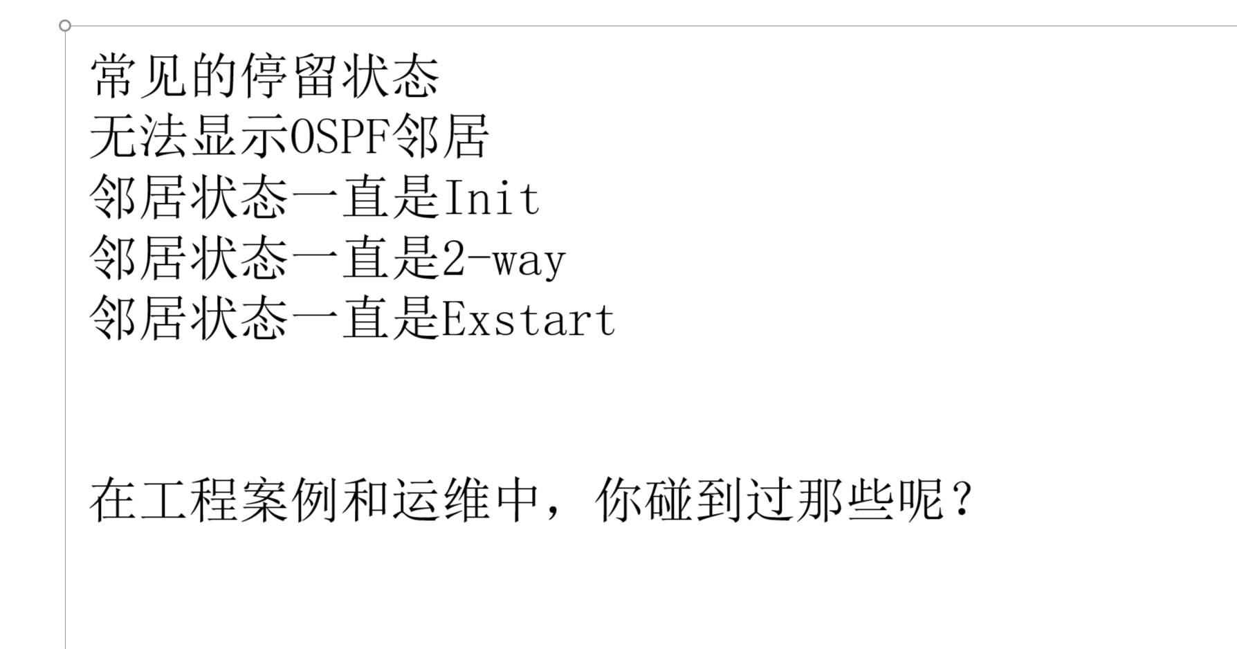 可能原因:错误配置DR优先级,广播网络中DR-Other之间的正常状态,OSPF网络类型不匹配